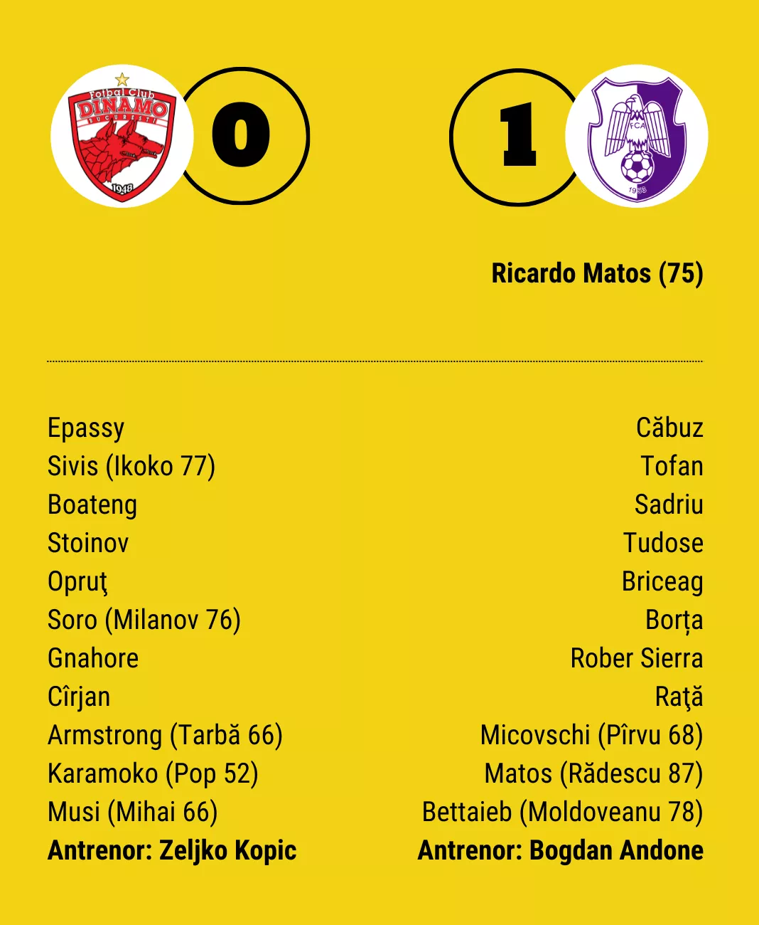 În minutul 68, Yanis Pîrvu a trimis periculos pe lângă poartă, iar câteva minute mai târziu Ricardo Matos a primit o minge în zona punctului de la 11 metri, a lăsat-o să cadă și a șutat din voleu, trimițând imparabil și reducând la tăcere dinamoviștii din tribune.