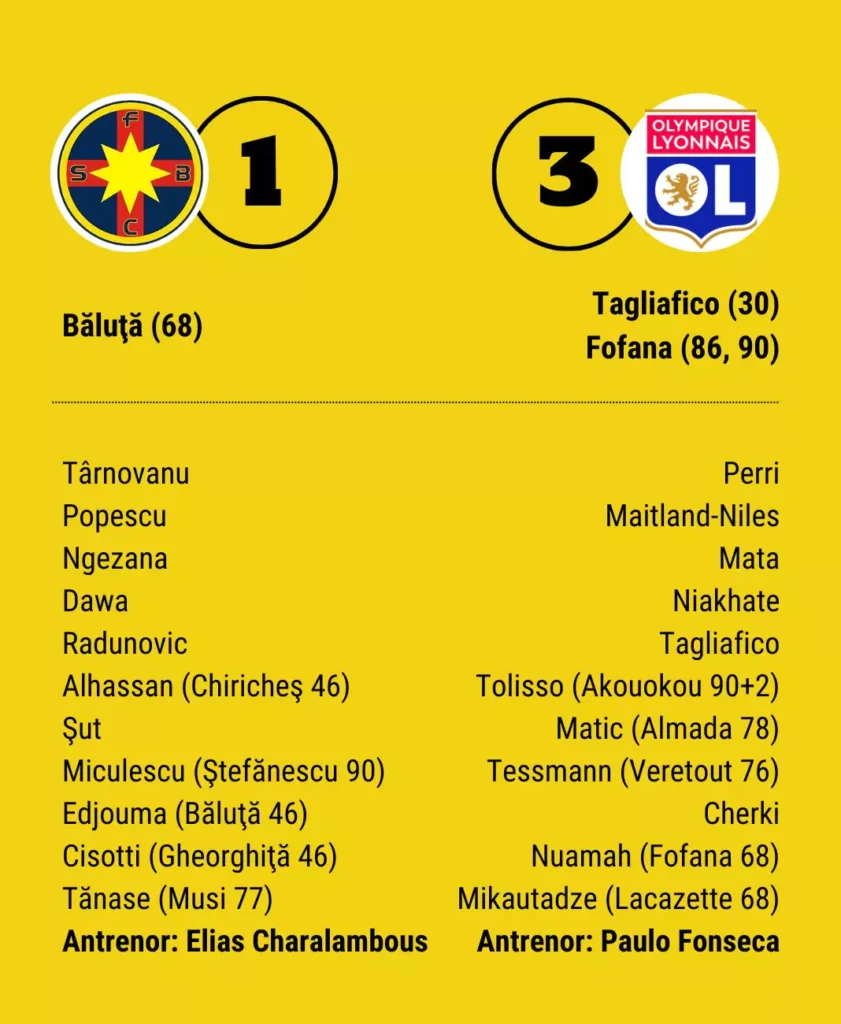 FC FCSB a cedat prima manșă disputată la București, pe Arena Națională, din optimile UEFA Europa League. S-a terminat 3-1 pentru francezii de la Olympique Lyon, iar returul se va disputa peste o săptămână, la Lyon.