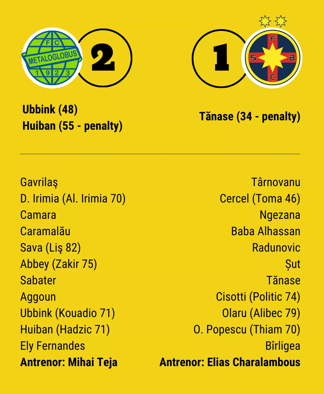 Într-un meci care a adus prima victorie în Superliga pentru Metaloglobus, bucureștenii ce își dispută meciurile de acasă în comuna Clinceni au reușit să răstoarne calculele hârtiei și să învingă FC FCSB cu scorul de 2-1.